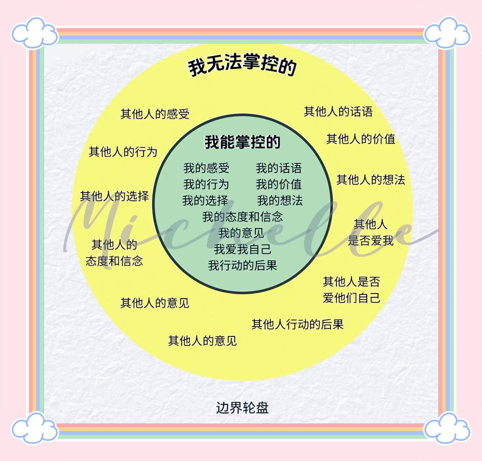 很多时候,我们的痛苦恰恰源于试图去控制那些我们根本无法控制的事情,比如他人的评价或选择。而边界轮盘,就像一张清晰的心理地图,帮助我们把精力和责任收回到自己身上,专注于那些我们真正有能力改变和影响的领域。