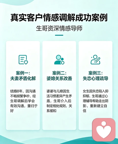 下面生哥资深情感导师给大家分享几个真实不同类型的情感调解成功案例,希望可以帮助到大家,可以直接借鉴思路。